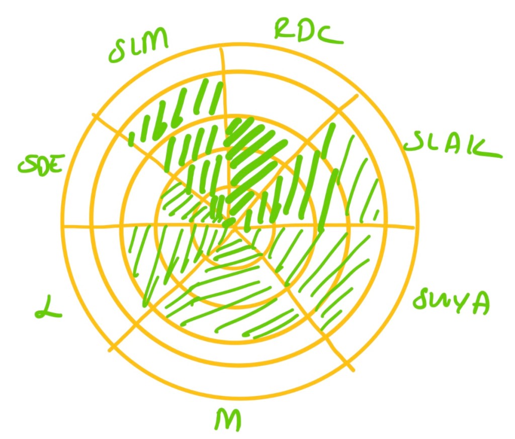 First, let’s start with reflecting on the past week with a new method. This is a method I learned from Ali Abdaal – I think -. I’ve been using this for the past few months and it really helped me to reflect on my life. The idea is that, to be happy and content with your life, you need to have an equal distribution of your time and effort for the areas of your life. (For a wheel to roll, it needs to have an equal radius from the central point.) For example, let’s say that you have three areas of your life that matter the most to you: Relationships, Career, and Kindness. After each week, you draw a circle and divide it into 3 (representing the 3 areas). Then you scale these areas from 1-5 according to the time and work you put into these areas. If they are equal to each other, then it means you maintained balance that week; if they are far apart, for example, if you have 1 for Relationships and 5 for Career, maybe it would be better to focus more on your relationships next week. I know this sounds confusing, but I’ll add one of my wheel of life’s for reference.